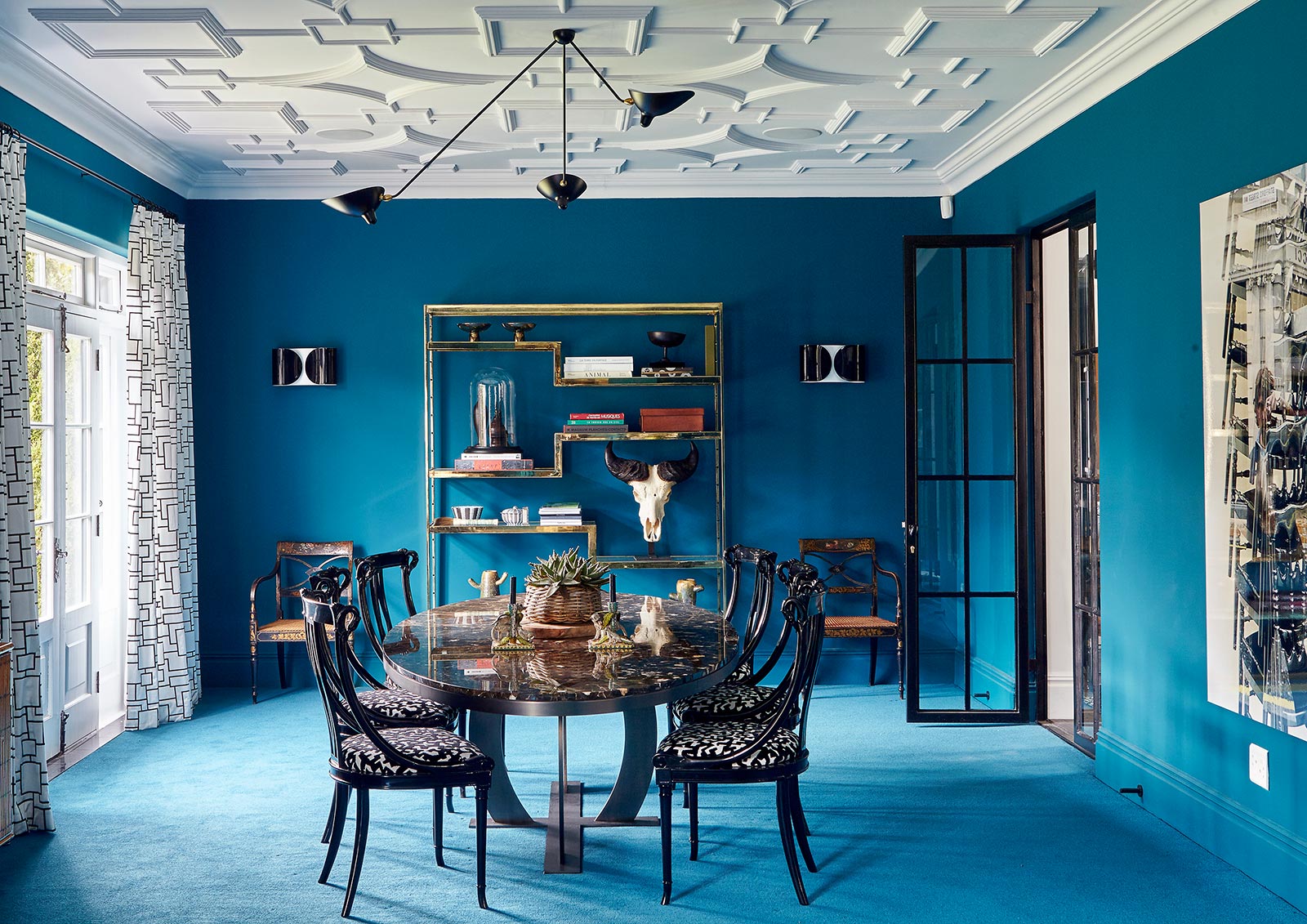 There are teal-blue walls and carpets in the living area, bright yellow walls in the guest room, lime-green walls in the boys’ bathroom, and a variety of black and white fabrics and tiles creating a kaleidoscope of pattern and animal print.